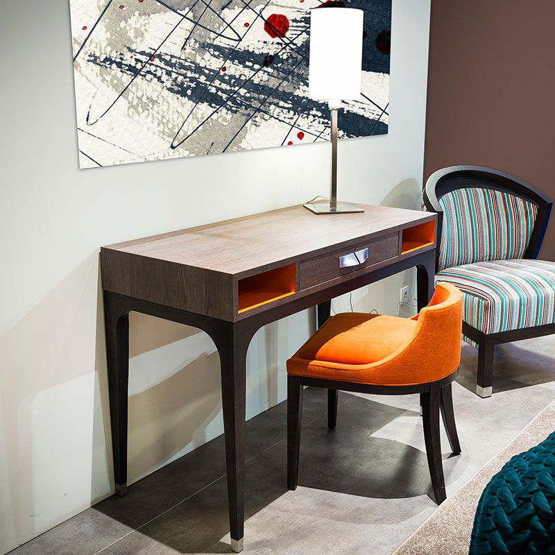 In business hotels, desks may include built-in cable management and power outlets for laptops and devices.