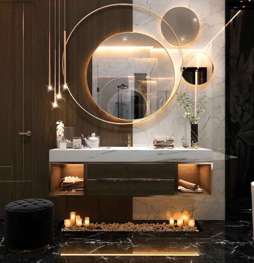 While bathrooms often use fixed installations, some furniture elements are still standard: